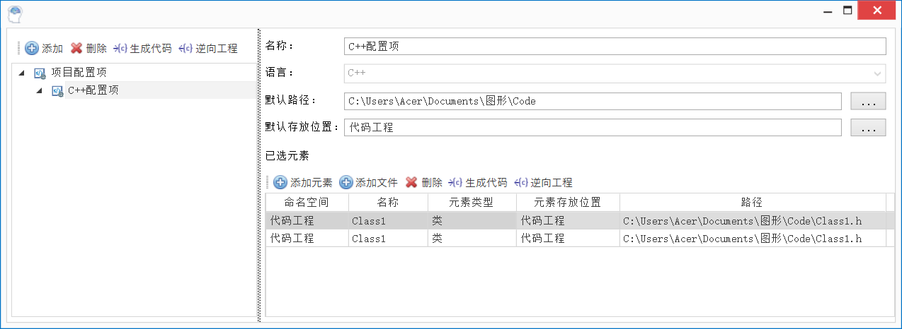 源代码“项目配置项”中会保存和“语言”(C、C++、C#、Java等)、代码默认存放路径(界面中的“默认路径”)、模型的默认命名空间位置(界面中“默认存放位置”),以及每个模型和代码之间的对应关系。可以通过点击主工具栏“视图”-->“配置项”打开项目配置项的管理窗口,如下图所示: