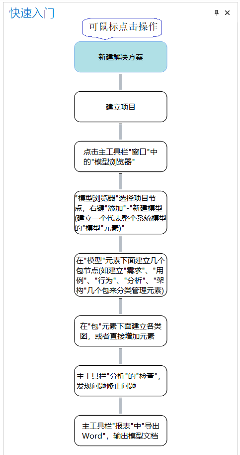 通过“快速指引”窗口中的按钮(每个方框是按钮,可以点击),可以进行快速的建立解决方案、项目、元素的操作。如果此窗口关闭,可以点击主工具栏“视图”—“窗口”—“快速入门”工具重新打开窗口。